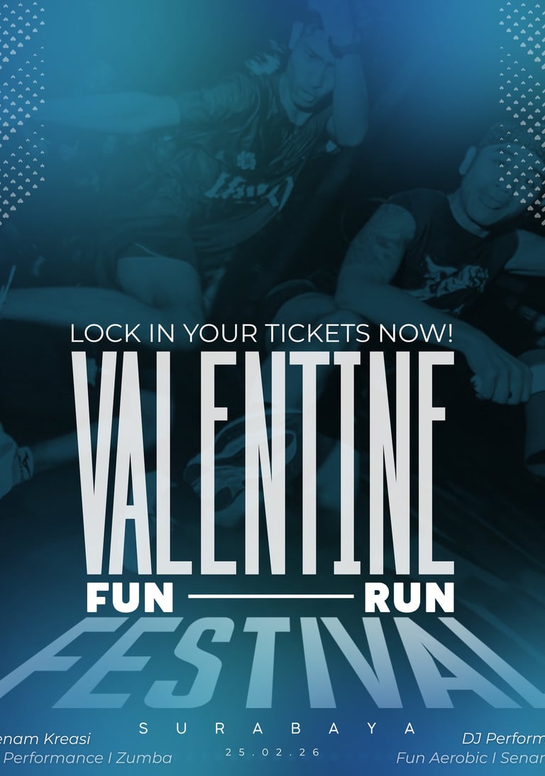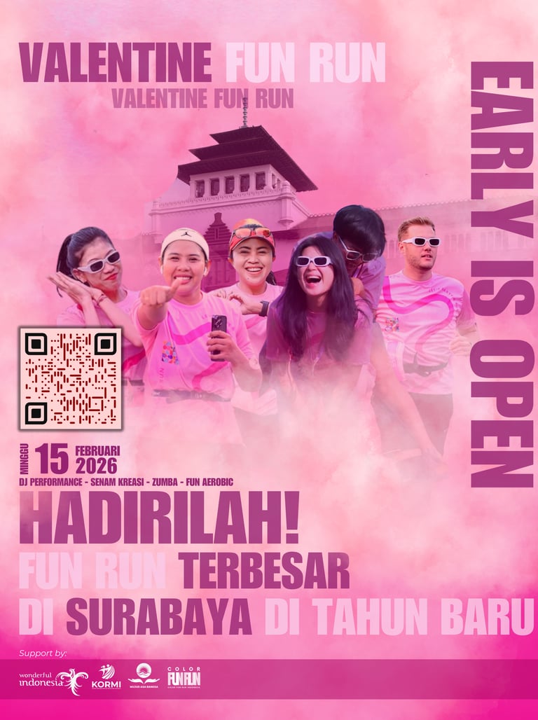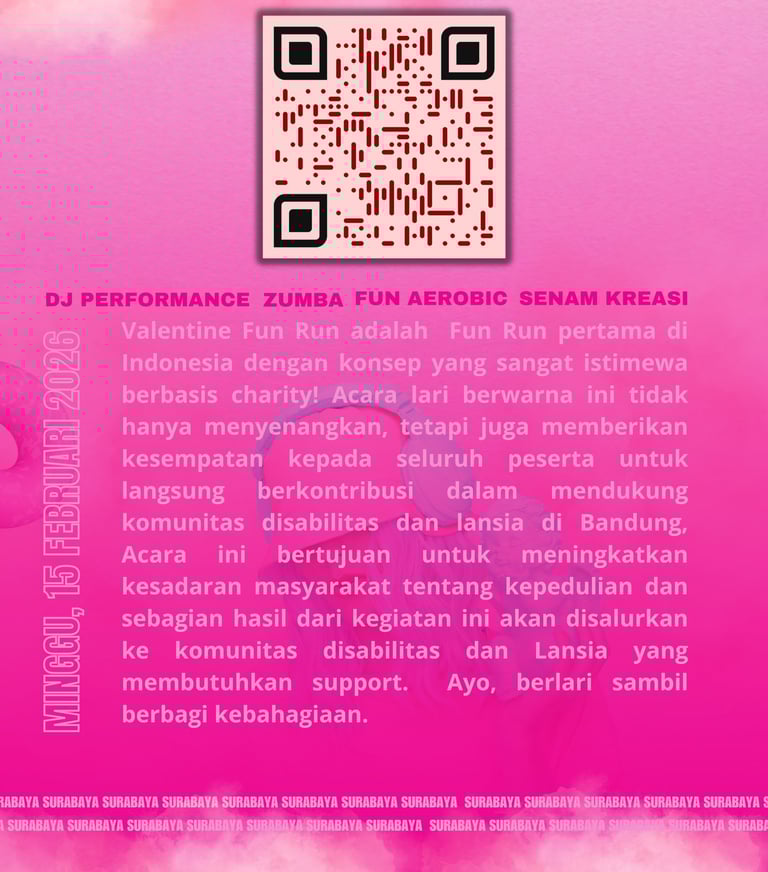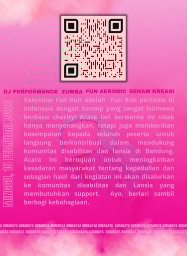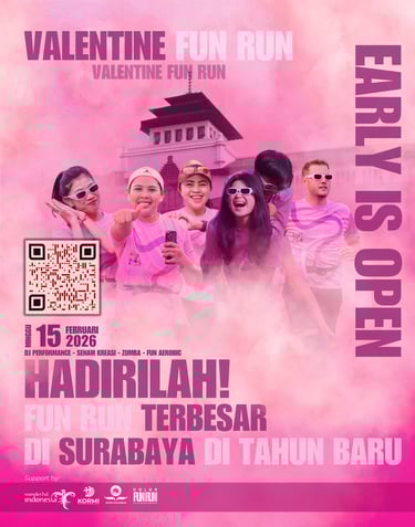 Ayo bergabung dalam EVENT VALENTINE FUN RUN WITH CHARITY terbesar se-Indonesia! Nikmati keseruan berlari penuh warna sambil berbagi kebahagiaan untuk sesama. Jangan lewatkan kesempatan untuk menjadi bagian dari acara penuh keceriaan ini!